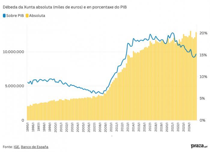 En 2026 os Orzamentos Xerais do Goberno galego prevén destinar 1.858,59 millóns a atender a débeda. É un 5,39% máis que o ano anterior.