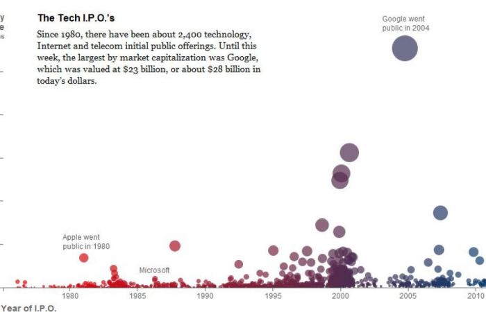 Hoxe sae a bolsa Facebook. The New York Times presenta unha completa infografía interactiva que compara os volumes de operacións semellantes doutras empresas tecnolóxicas nos últimos anos, así coma o seu comportamento no seu primeiro día nos mercados e en períodos máis longos.
