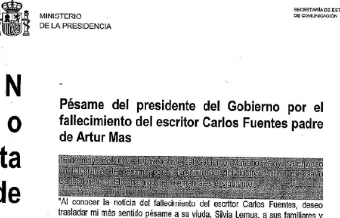 Os servizos de comunicación do Ministerio da Presidencia trabúcanse e converten o falecido escritor mexicano Carlos Fuentes no "pai de Artur Mas". En El Mundo.