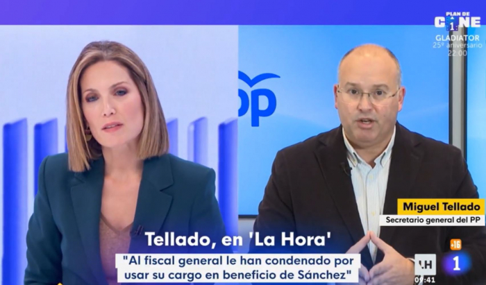 Miguel Tellado denuncia a "utilización política dos medios públicos", aos que acusa de "atacar o Poder Xudicial". "Preocúpame que desde unha canle pública, pagada cos impostos de todos os españois, se fale de golpismo xudicial", dixo intervindo ao vivo en TVE durante unha entrevista coa xornalista Silvia Intxaurrondo, á que criticou, no programa La Hora de la 1.