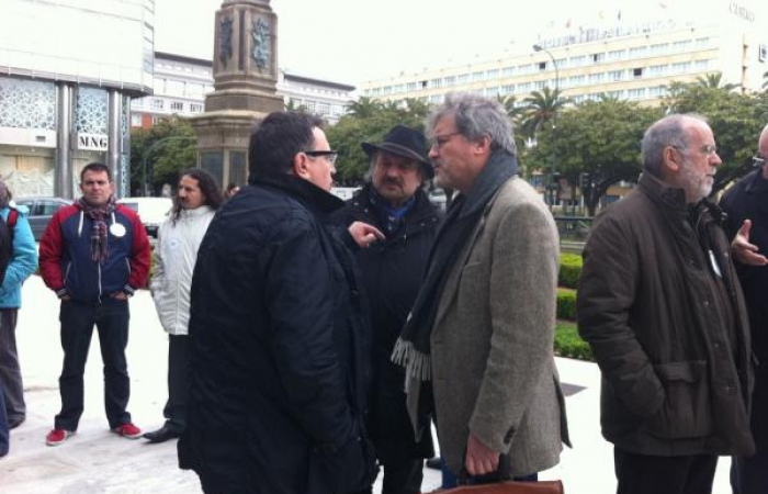Veñen de celebrarse concentracións de xornalistas en Compostela, A Coruña, Pontevedra e Vigo. Na imaxe, o acto da Coruña, onde acudiron, por exemplo, Manuel Rivas e Xosé Manuel Pereiro (via @apcoruna). Pola tarde, haberá tamén concentración en Lugo