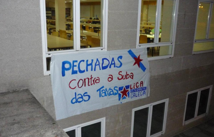 Uns 30 membros da Liga Estudantil Galega péchanse na biblioteca de Torrecedeira, en Vigo, en protesta pola suba das taxas universitarias decidida polo Goberno central.