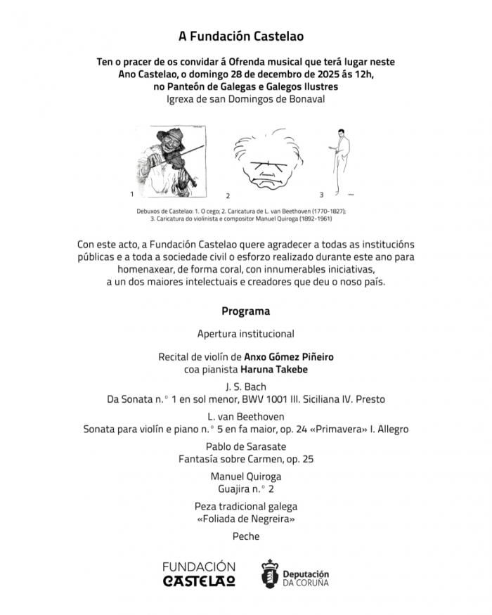 A Fundación Castelao clausura o Ano Castelao o domingo 28 cunha cerimonia musical no Panteón de Galegas e Galegos ilustres, na igrexa de San Domingos de Bonaval, en Santiago de Compostela. O violinista Anxo Gómez Piñeiro, acompañado pola pianista Haruna Takebe, interpretarán pezas clásicas de Bach e Beethoven, así como obras de Pablo de Sarasate e Manuel Quiroga, e mais a Foliada de Negreira, peza tradicional adorada por Alfonso Daniel Rodríguez Castelao. O acto será aberto ao público e comezará ás 12 do mediodía.