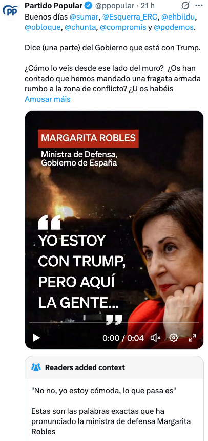 O PP inventa que a ministra de Defensa afirma "estou con Trump" ante o embaixador dos EUA e esgrime unha falsa transcrición dun vídeo no que Margarita Robles di "estou cómoda" en referencia á temperatura da estancia onde se celebraba a xuntanza, o pasado día 4. Horas despois de que ficase amplamente acreditado que a acusación non se correspondía coa realidade a formación encabezada por Alberto Núñez Feijóo reiterou a falsa transcrición a través das redes sociais mentres, nun acto público, o ex-presidente galego acusaba a Pedro Sánchez de mentir a respecto da ausencia de apoio do Goberno de España a Trump no ataque a Irán.