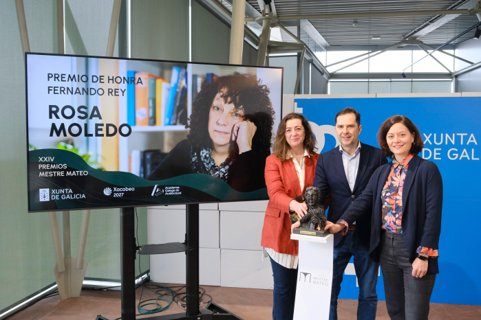 A asesora lingüística e tradutora Rosa Moledo, Premio de Honra Fernando Rey da Academia Galega do Audiovisual. O galardón, que recibirá na gala dos XXIV Premios Mestre Mateo o vindeiro 21 de marzo no auditorio Fuxan os Ventos de Lugo, recoñece unha traxectoria profesional de máis de trinta anos vencellada ao audiovisual galego, caracterizada polo rigor lingüístico, o compromiso coa lingua e unha achega fundamental á calidade das producións de cine, televisión e plataformas audiovisuais. Moledo traballou en numerosas obras audiovisuais para cinema, televisión e plataformas, como A lingua das bolboretas, Os luns ao sol, O lapis do carpinteiro, Cela 211, Os Fenómenos, O noso último verán en Escocia, Lupin, Mareas Vivas, 4º sen ascensor, A familia Pita, Fariña, O caso Asunta, ou Rondallas, entre outras moitas. Na imaxe, Lucía Veiga e Carmen Méndez, presidenta e vicepresidenta da Academia, anunciando o galardón xunto a Jacobo Sutil, director da Agadic [© Javi G. Sobrado]