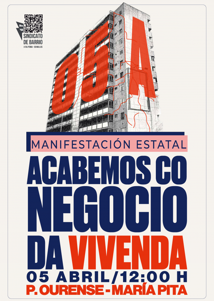A Coruña, Santiago, Ourense e Vigo acollen este sábado mobilizacións polo dereito á vivenda no marco da convocatoria estatal que xunta ata 40 puntos de manifestación. As protestas da Coruña e Compostela comezan ás 12 -Praza de Ourense e Praza do Toural, respectivamente-, a de Ourense principia ás 18h30 ante a sede do IGVS na cidade e a de Vigo, ás 19h dende a Praza dos Cabalos.