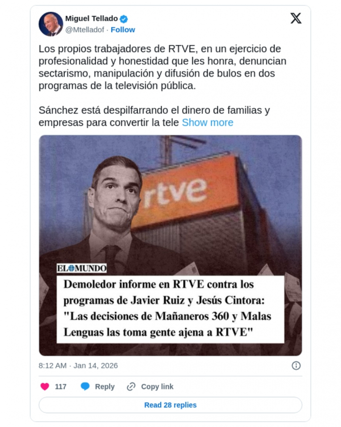 Tellado eloxia que persoal dos medios públicos "denuncie sectarismo" e "manipulación" como un "exercicio de profesionalidade e honestidade". O 'número dous' de Alberto Núñez Feijóo na dirección estatal do PP refírese a RTVE. Concretamente, a un informe do Consello de Informativos de Televisión Española sobre os programas Malas Lenguas e Mañaneros, coproducidos por empresas externas e aos que atribúe nesgos xornalísticos e malas praxes profesionais. Persoal da CSAG -antiga CRTVG- esixe dende hai anos a creación dun Consello de Informativos como unha das vías para frear a "manipulación" informativa nos medios públicos galegos, que tamén relacionan coa externalización de diversos programas.
