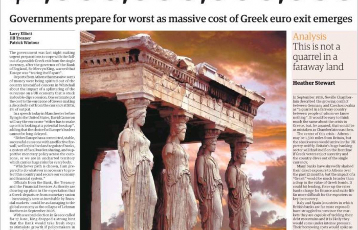 The Guardian afirma na súa portada que a saída de Grecia do euro lles custaría ao resto dos países 1 billón de euros