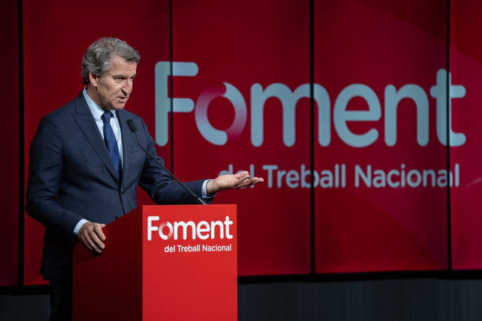 Feijóo pide á patronal catalá Foment del Treball Nacional que convenza a Junts per Catalunya para apoialo nunha moción de censura contra Pedro Sánchez, operación que necesariamente implicaría os votos de Vox. Esgrimindo razóns coma o encarceramento do ex-ministro Ábalos, o ex-presidente da Xunta e actual líder estatal do PP que o "compromiso" que asumiría nese hipotético escenario sería convocar eleccións xerais. [Imaxe: © PP]