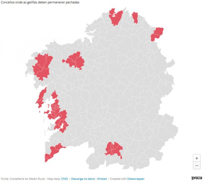 O Ministerio de Agricultura levanta o confinamento de galiñas agás en 40 concellos galegos. A cría en liberdade das aves de curral será posible en 273 municipios de Galicia pero continuará prohibida en 40 por seren zonas de especial risco ou vixilancia. Podes consultar aquí o mapa coas localidades onde as galiñas teñen que seguir pechadas.