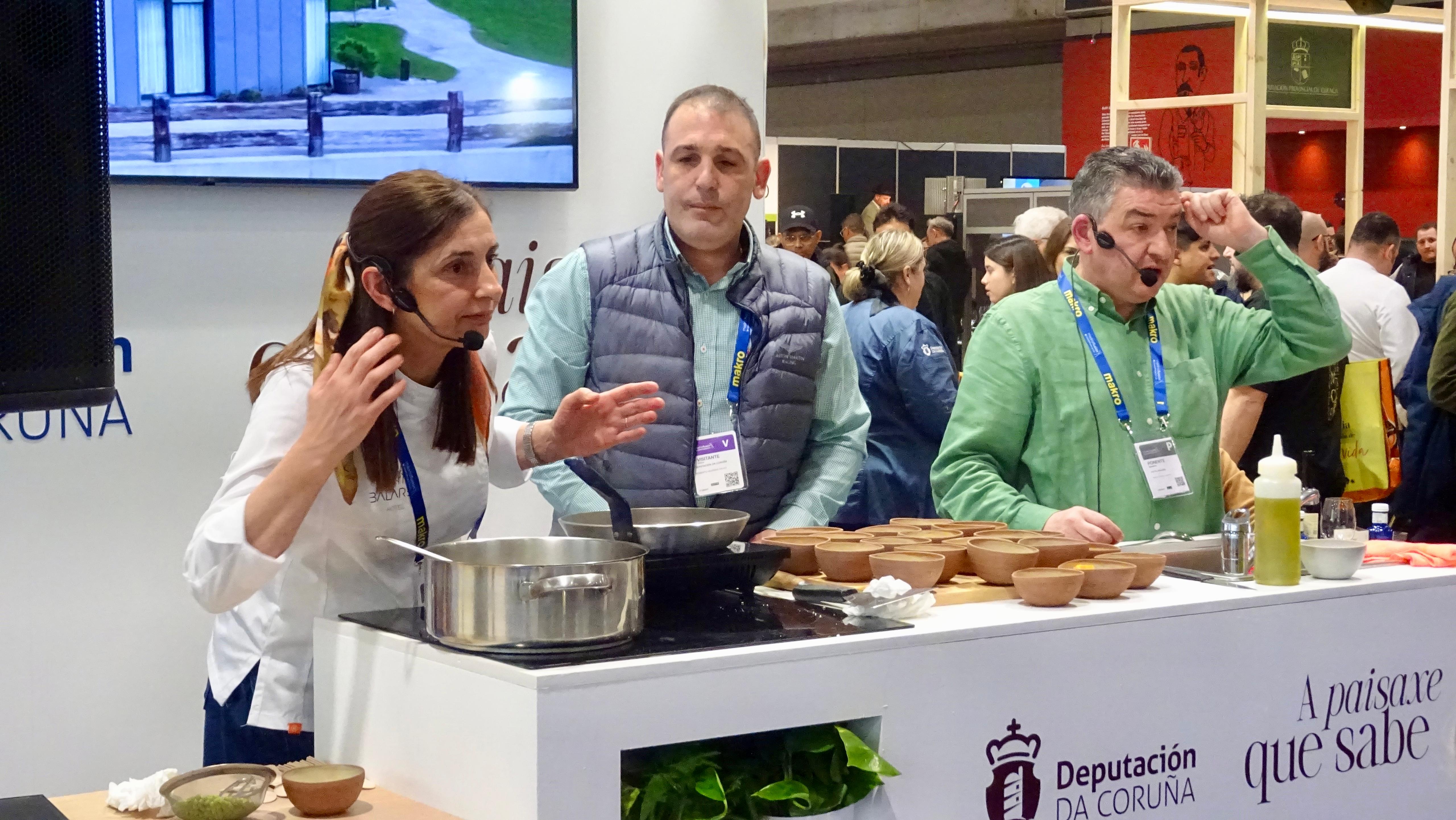 Fabián Mouzo, do restaurante O Camiño Fala de Mazaricos; Silvia Facal e Rafa Varela, do restaurante Balarés de Ponteceso; e Lucía Freitas, do restaurante A Tafona de Santiago, fixeron demostracións de cociña en directo no stand da Deputación da Coruña