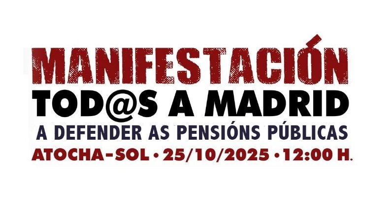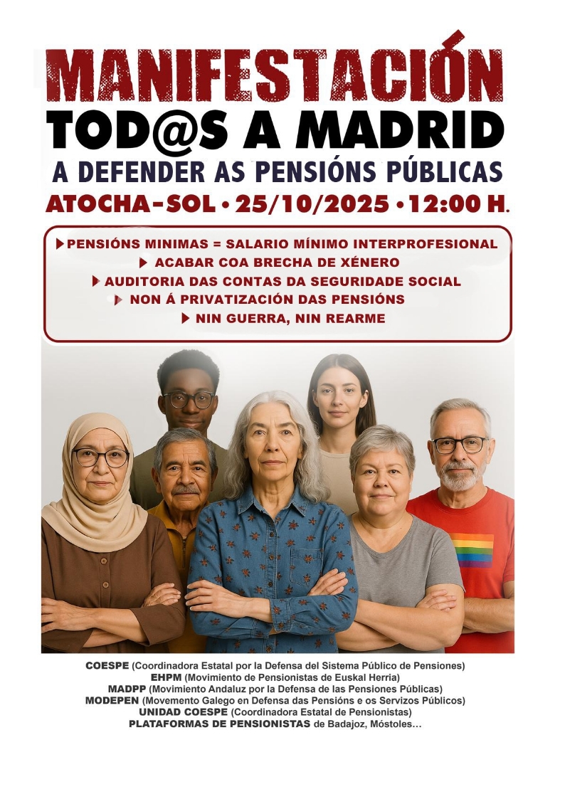 A Unidade de Acción pensionista (COESPE, EHPM (Euskal Herria) MADPP (Movimiento Andaluz), MODEPEN (Movemento Galego), UNIDADE COESPE, Plataformas de pensionistas de Badajoz, Móstoles…) convoca unha nova manifestación o 25 de outubro co lema xeral: Pola dignidade das pensións públicas, pensión mínima igual ao SMI xa!