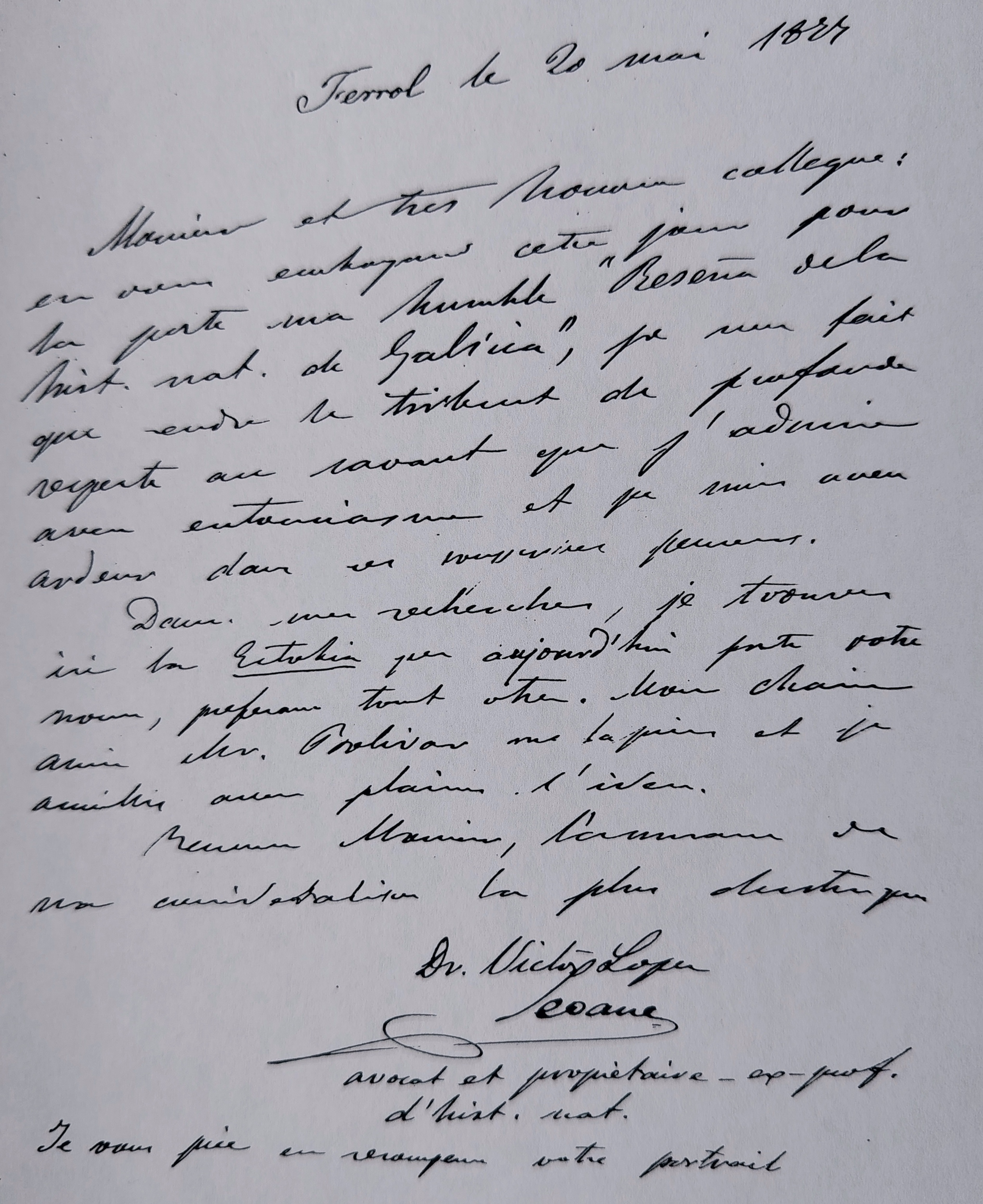 O naturalista galego retomara nos anos setenta, con moito vigor, a súa carreira científica e contactos con colegas. Nese contexto remitiulle a Haeckel unha carta o 20 de maio de 1877 desde Ferrol. Está escrita en francés, pois ese era o idioma estranxeiro que coñecía, como case toda a xente culta do seu tempo. Polo que indicaba no escrito, enviou coa carta o exemplar dunha publicación súa, a Reseña de la Historia Natural de Galicia, sinalando que era como “tributo de profundo respecto a un sabio que admiro con entusiasmo”, engadindo que seguía con moito interese as súas interesantes pescudas.