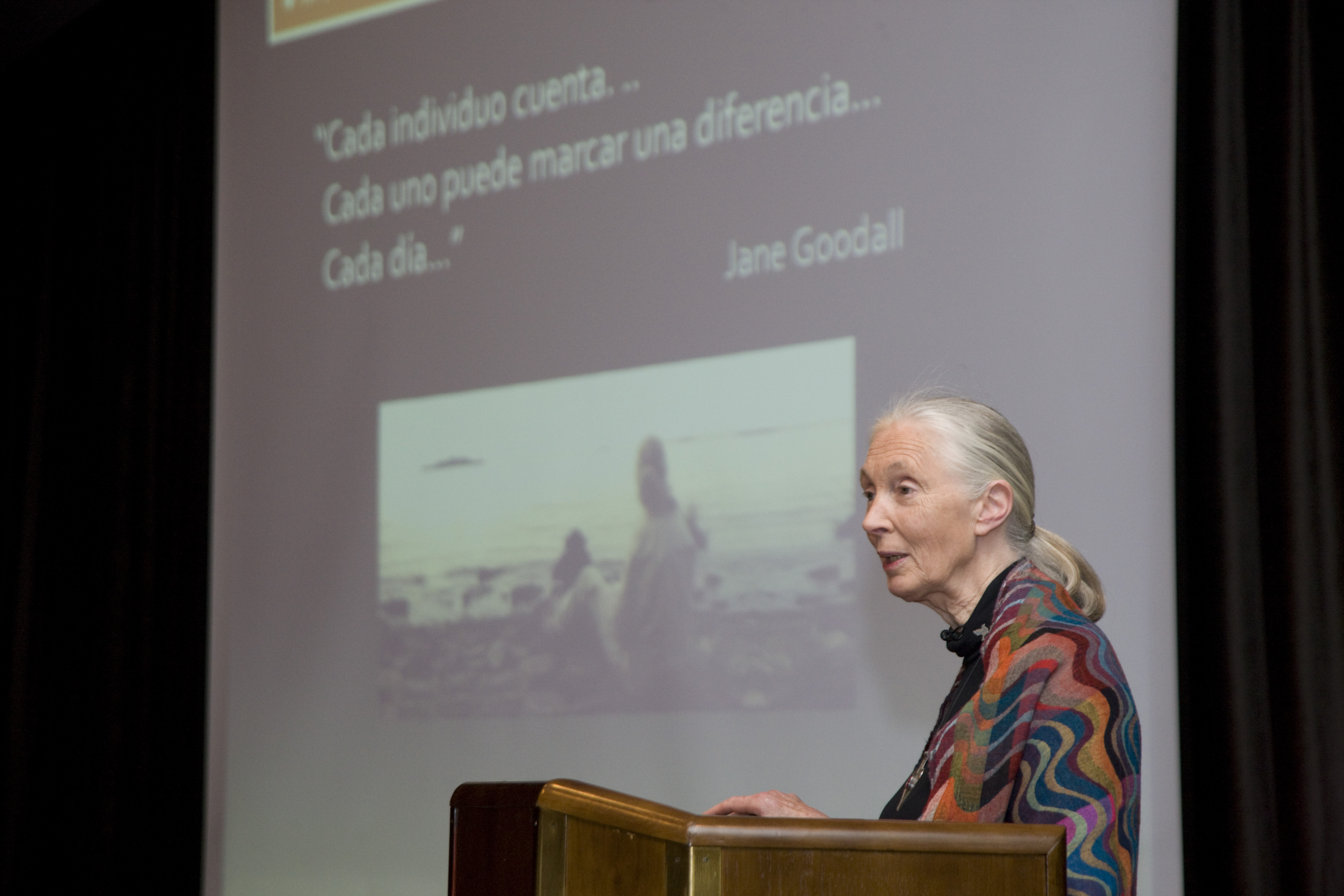Tras a visita á Domus nos trasladamos ao Pazo da Ópera coruñés, en cuxa sala de cámara tería lugar a conferencia de Jane ás 20 horas. Agardou ata ese momento sentada nun espazo adxunto, no que –acompañada do seu inseparable Mister H–descansou e tomou notas. No comezo da conferencia a sala estaba ateigada, cunhas 400 persoas, e no exterior do recinto permanecían bastantes que, lamentablemente, non puideron acceder polo límite de aforo do local. Tras unhas verbas de presentación Jane falou de “O que aprendín dos chimpancés. A conservación das especies ameazadas”. Presentou a experiencia que tivera como primatóloga defendendo o seu compromiso por unha conciencia ambiental global. Asemade, explicou as revolucionarias conclusións ás que chegou durante as investigacións que realizou en Gombe e afirmou que a preservación de especies como os chimpancés depende de factores maioritariamente económicos.