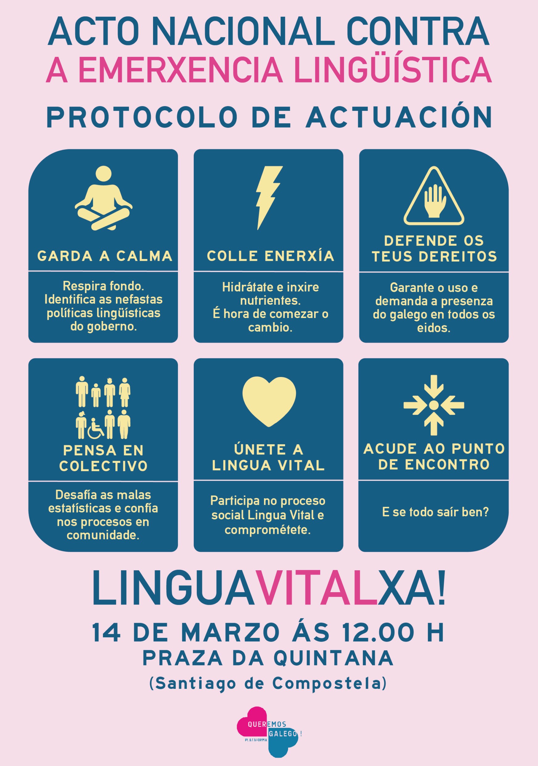 Logo de todo o traballo, as conclusións do proceso Lingua Vital serán presentadas por Queremos Galego este vindeiro sábado 14 de marzo nunha asemblea aberta que se celebrará na Praza da Quintana de Santiago ás doce do mediodía. O acto, como explicou o voceiro da plataforma cidadá, Marcos Maceira, "marcar un punto de inicio para que entidades sociais, concellos, deputacións e a propia Xunta teñan claro que medidas cómpre desenvolver".