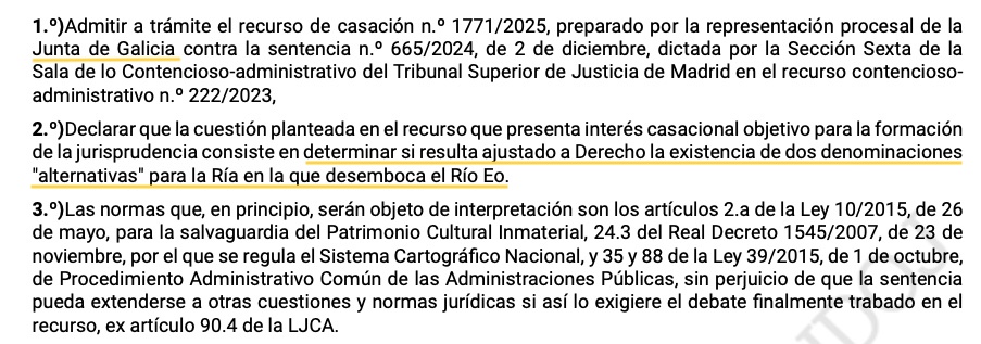 O Instituto Geográfico Nacional (IGN) leva varios anos tentando que a Ría de Ribadeo se chame tamén Ría del Eo, como quere Asturias, unha iniciativa que en 2022 tivo que volver tramitar por irregularidades na súa primeira aprobación. Ese mesmo ano, en novembro, o IGE volveu aprobar a dupla denominación, aceptada o pasado decembro como legalmente tramitada polo Tribunal Superior de Justicia de Madrid. A Xunta recorreu esa sentenza para que a ría siga sendo só "de Ribadeo" e agora o Tribunal Supremo vén de admitir a trámite o seu recurso de casación. Faino nun auto no que se refire á Xunta de Galicia como "Junta de Galicia".