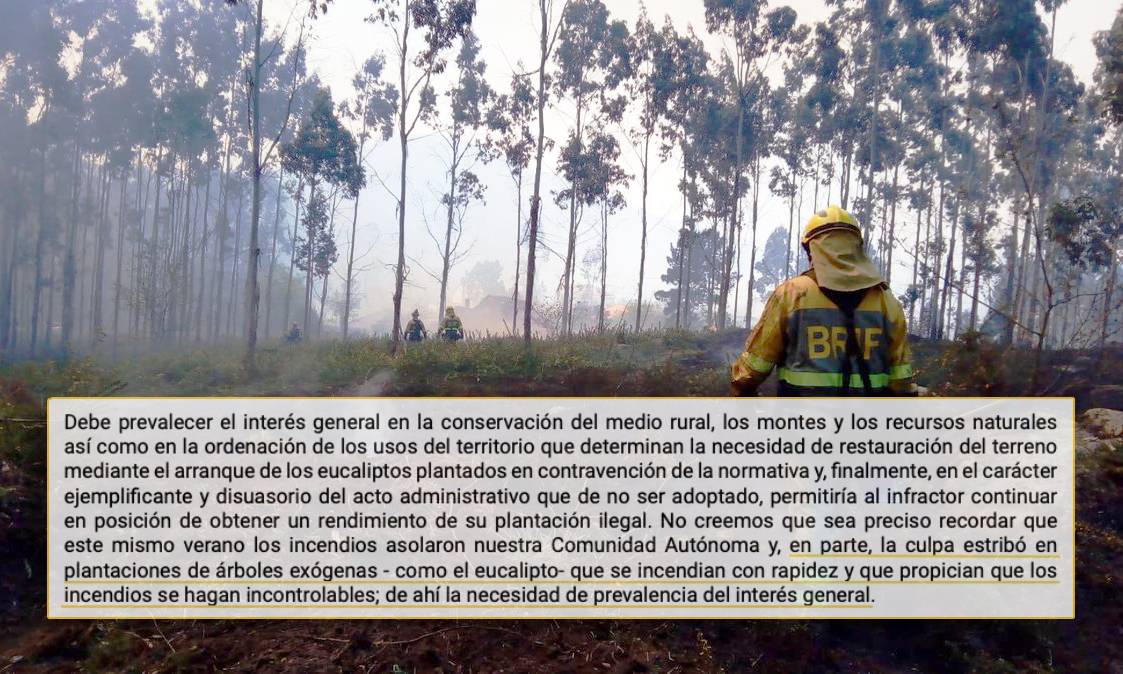 "En parte, a culpa estribou en plantacións de árbores esóxenas -como o eucalipto- que se incendian con rapidez e que propician que os incendios se fagan incontrolables", di o Goberno galego nun preito sobre unha plantación ilegal