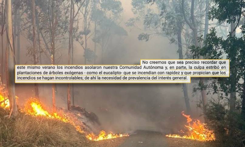 Pero a letrada da Xunta, sempre segundo o TSXG, introduciu un argumento máis na defensa da súa postura: "Non cremos que sexa preciso lembrar que este mesmo verán os incendios asolaron a nosa Comunidade Autónoma e, en parte, a culpa estribou en plantacións de árbores esóxenas -como o eucalipto- que se incendian con rapidez e que propician que os incendios se fagan incontrolables, de aí a necesidade de prevalencia do interese xeral".