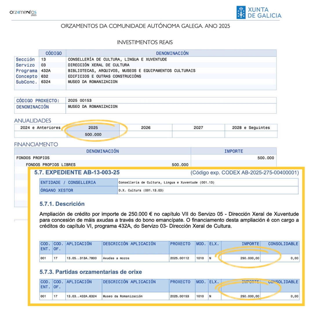 Tres anos despois, os avances foron inexistentes. Así vén sucedendo aínda que neste 2025 o proxecto do Museo da Romanización contou cuns testemuñais 500.000 euros nos Orzamentos Xerais da Xunta. A metade desa partida, 250.000 euros, foi desviada pola Consellería de Cultura a outra finalidade: contribuír ao financiamento do Bono Emancípate, as axudas para a compra de mobles e outro equipamento estreadas este ano polo Goberno galego para menores de 36 anos que alugasen unha vivenda (un pago único de 1.500 euros) ou a mercasen (3.000), para as que o Executivo dispuxera uns fondos iniciais de 1,9 millóns.