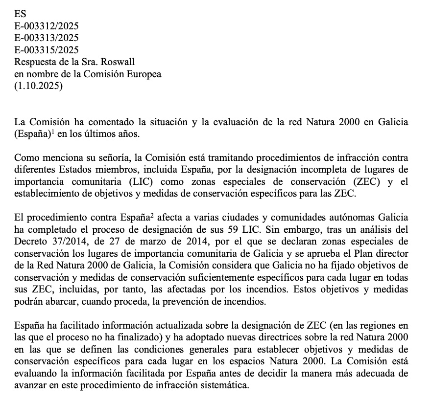 A resposta da Comisión é un mesmo escrito para as tres preguntas, asinado pola comisaria de Medio Ambiente, Jessika Roswall. Nel lembra que a UE está a tramitar a respecto da Rede Natura procedementos de infracción por unha banda "pola designación incompleta de lugares de importancia comunitaria (LIC) como zonas especiais de conservación (ZEC)" e por outra polo "establecemento de obxectivos e medidas de conservacións específicos para as ZEC", en referencia a dúas figuras de protección contempladas na Rede Natura.