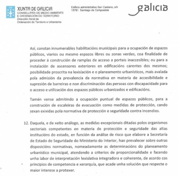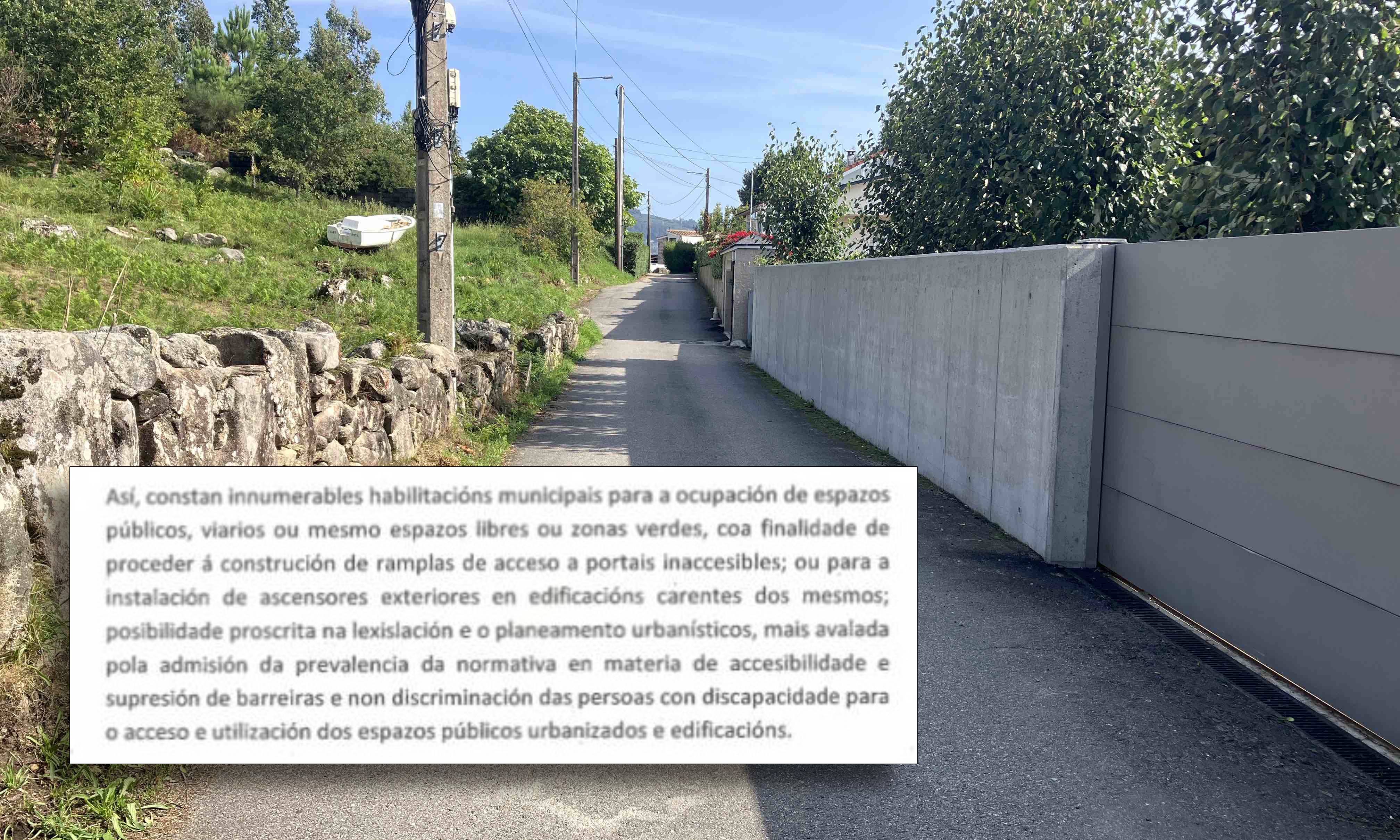 Rivas xustifica que "as ocupacións puntuais do dominio público viario, ou mesmo do sistema de zonas verdes e espazos libres públicos, son habituais" en casos como "a construción de ramplas de acceso a portais inaccesibles, ou para a instalación de ascensores exteriores en edificacións carentes dos mesmos". Unhas excepcións ao planeamento urbanístico xeral, como no caso de Moaña, que se amparan na "prevalencia da normativa en materia de accesibilidade e supresión de barreiras e non discriminación das persoas con discapacidade".