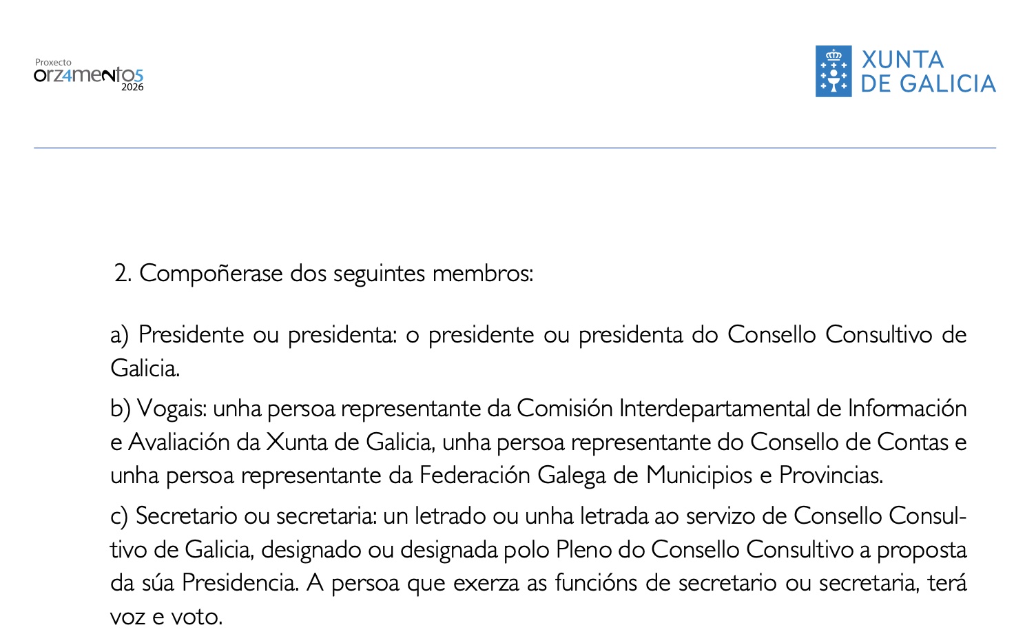 Coa reforma que impulsa a Xunta a Comisión da Transparencia pasa a estar adscrita ao Consultivo e estará presidida agora polo presidente dese órgano e outras catro persoas con voz e voto: un letrado do mesmo Consultivo proposto polo presidente e representantes da Xunta, o Consello de Contas e a Fegamp.