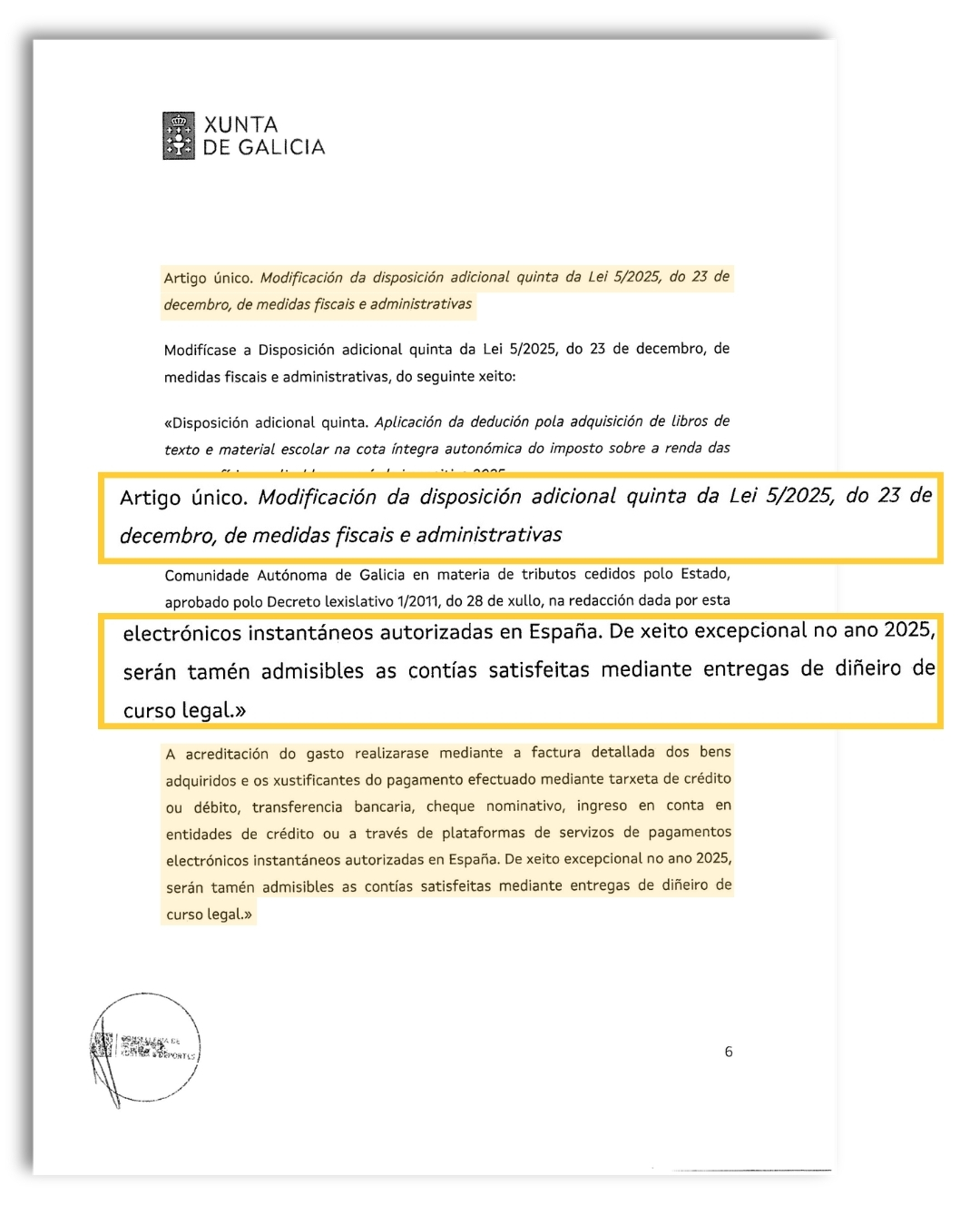 Coa reforma urxente que quedará aprobada tamén entrarán "con carácter excepcional" no desconto do IRPF as familias que mercasen os libros en efectivo se cumpren o resto de requisitos -incluíndo a presentación de facturas-. Trátase, di a xustificación da lei, de "non prexudicar a quen realizaron o gasto en material escolar e libros de texto descoñecendo que non se ía admitir como medio válido para acreditar o mesmo" o pagamento con cartos.