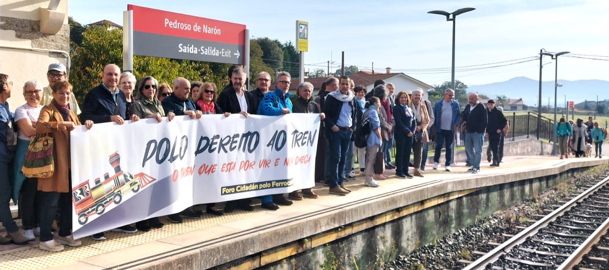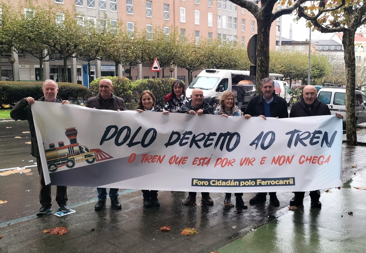 "Polo dereito ao tren, o tren que está por vir e non chega", reza a pancarta do Foro, que logrou unha unanimidade na protesta —do PP ao PSdeG, pasando polo BNG, e coa adhesión de todo o Parlamento e de concellos gobernados por diferentes partidos— que agocha tamén unha asunción de responsabilidades. A unanimidade de agora na reivindicación tamén existía na actitude contraria: ningunha administración de ningún partido deu resposta ás demandas.