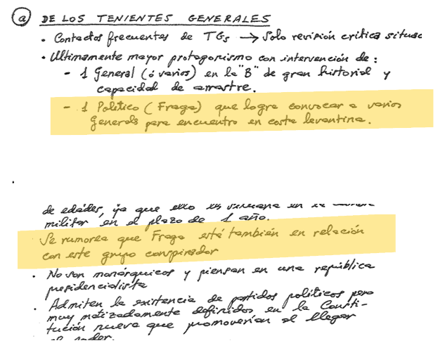 Nesta operación de tenentes-cororoneis, “ao non haber cobertura política de partido, Fraga estaría intentando ser o líder civil”. Iso si, o manuscrito engade que “se considera que os militares son contrarios a un protagonismo tipo Pinochet o Videla”.