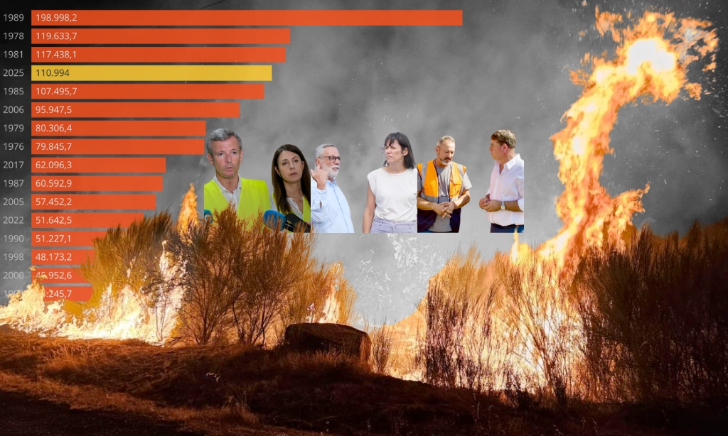 As máis de 110.000 hectáreas que suman os incendios comunicados pola Xunta xa fan que 2025 substitúa a 2006 como o ano con máis monte ardido dende a catastrófica vaga que desbordou o Goberno de Laxe
