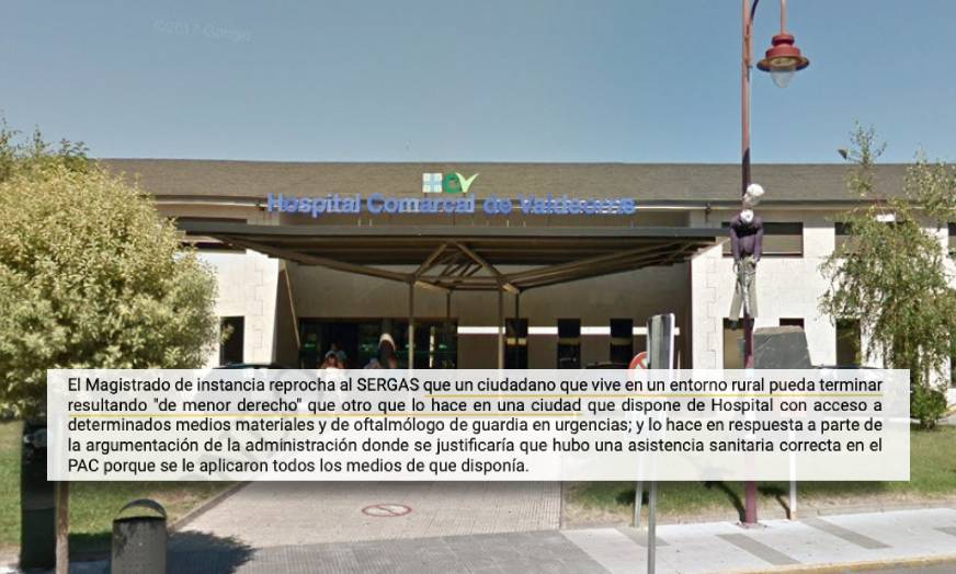 O maxistrado mesmo reprocha ao Sergas "que un cidadán que vive nunha contorna rural poida terminar resultando 'de menor dereito' que outro que o fai nunha cidade que dispón de hospital con acceso a determinados medios materiais e de oftalmólogo de garda en urxencias".
