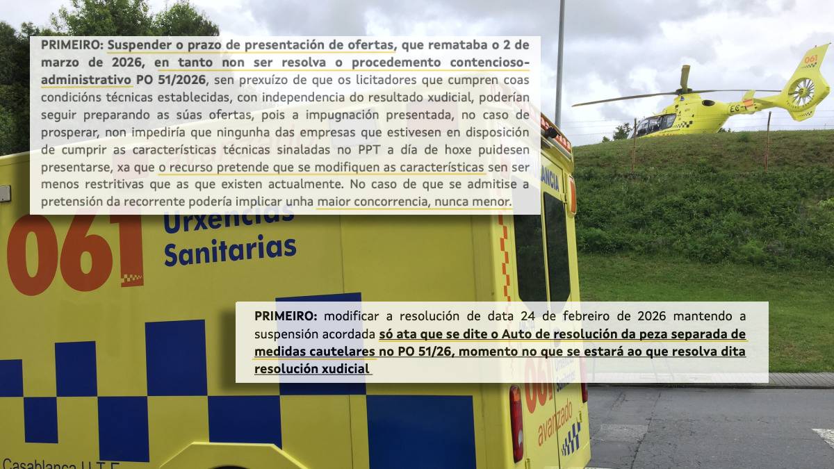 O concurso para a renovación dos dous helicópteros de emerxencias sanitarias do 061 foi recorrido ante a xustiza hai tres semanas logo de que varias empresas sospeitasen dun posible amaño nas súas condicións. Ante ese recurso, e sen que a xustiza establecese aínda ningunha medida cautelar, a Xunta decidiu paralizar o concurso "en tanto non se resolva o procedemento contencioso-administrativo", isto é, ata que haxa sentenza, o que pode tardar anos. Mentres o servizo seguiría prestado en precario e por razón de interese público pola empresa que xa o vén facendo, Eliance, que acumula ducias de incumprimentos.