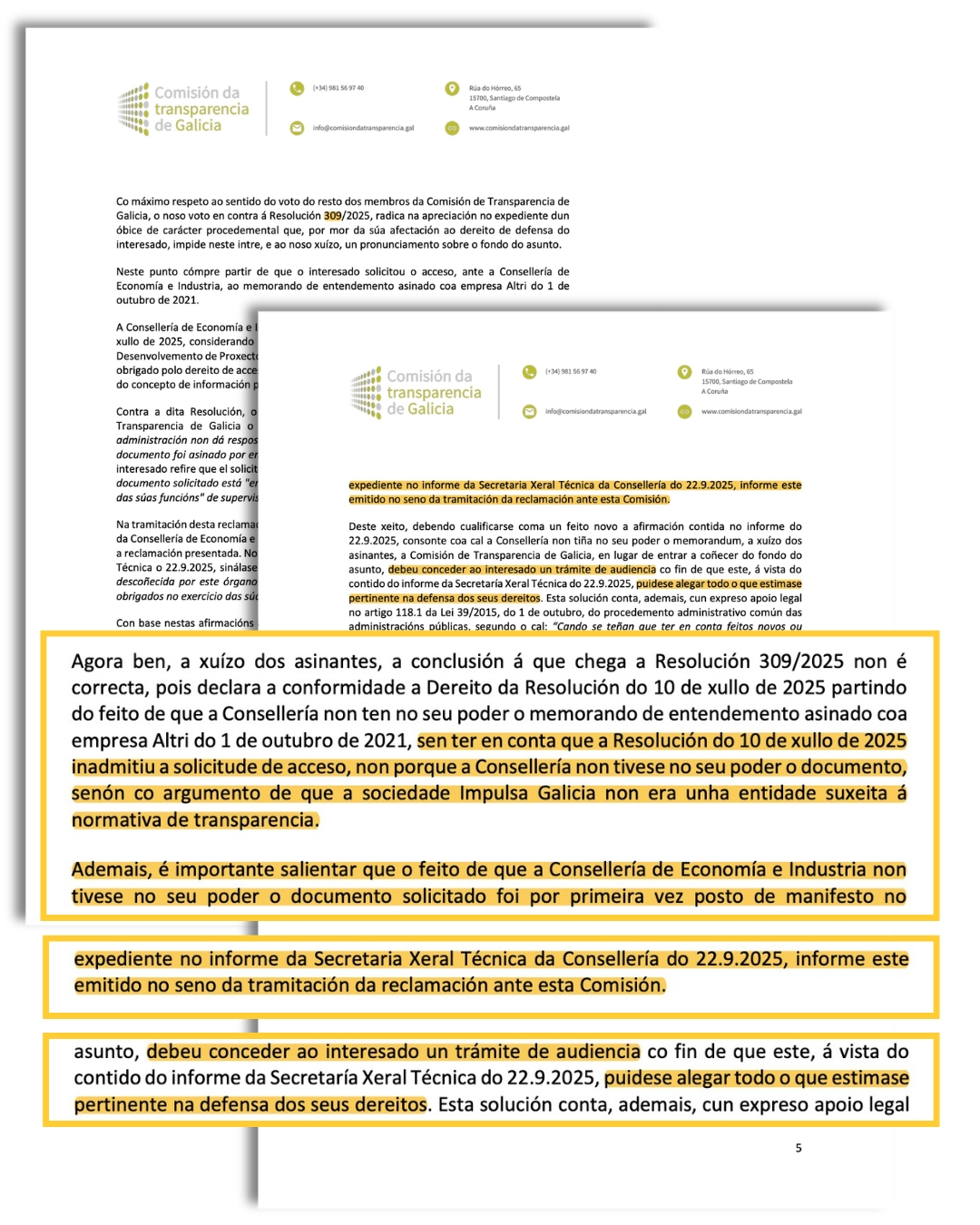 A representación nese órgano do Consello Consultivo e do Consello de Contas asinaron unha inédita xustificación conxunta de voto discrepante sobre o xeito en que a Xunta argumentou, tras dar outras motivacións, que non pode entregar o acordo con Altri porque non está no seu poder nin o coñece. Un argumento novo que foi validado por outros vogais da Comisión da Transparencia sen permitir alegar a Praza.gal, o que puido vulnerar os seus dereitos.