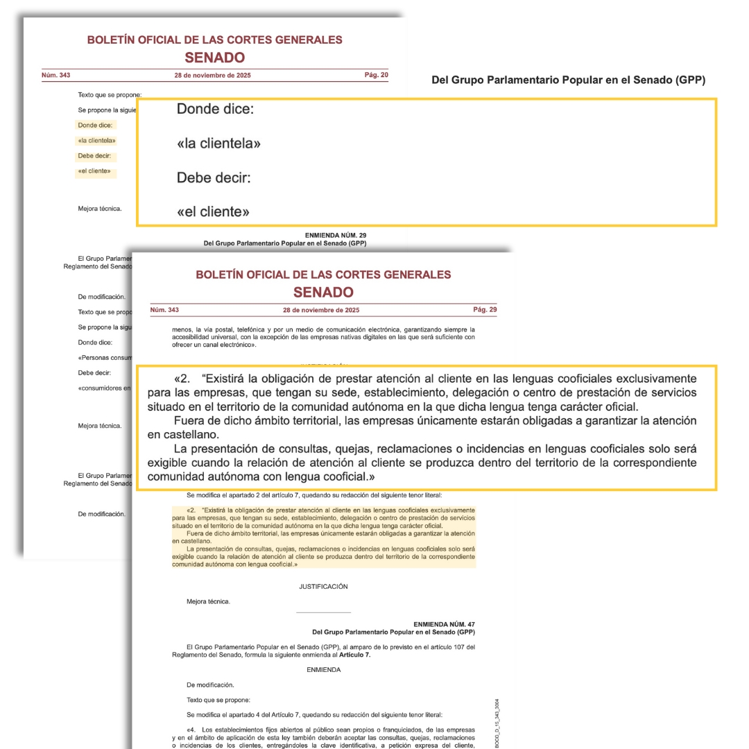 A dirección estatal do PP tenta frear este precepto acoutándoo dende o Senado. Así, nunha das súas emendas, limitan a "obriga de prestar a atención ao cliente nas linguas cooficiais" -en referencia aos idiomas oficiais distintos do castelán- "exclusivamente para as empresas que teñan a súa sede, establecemento, delegación ou centro de prestación de servizos situado no territorio da comunidade autónoma" que corresponda.