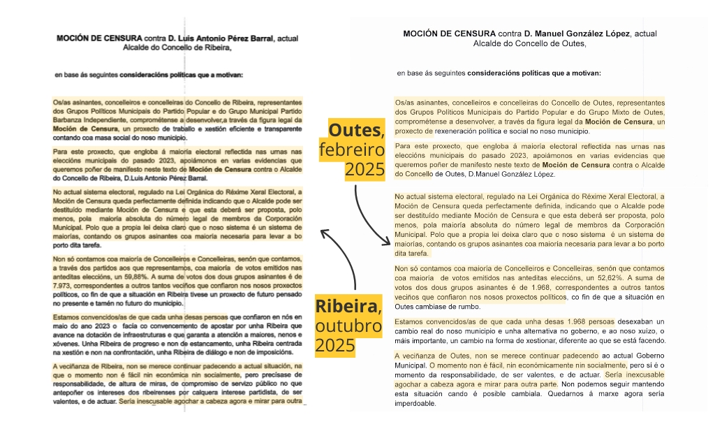 A través dun vídeo, o BNG de Outes sinalou as semellanzas nas exposicións de motivos de ambas mocións de censura nos correspondentes plenos de febreiro e outubro deste ano. A revisión dos textos completos rexistrados en ambos consistorios acredita a coincidencia. Parágrafos idénticos nos que só mudan referencias ao nome da vila, o seu número de habitantes ou as persoas que ocupan os cargos combínanse con outros con pequenas engádegas ou expresións reformuladas.