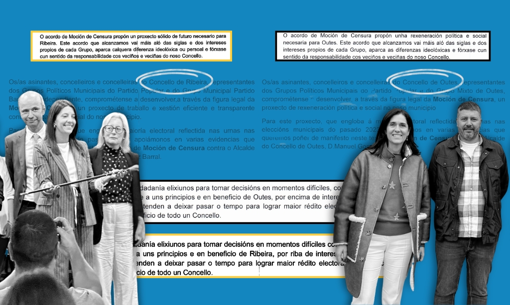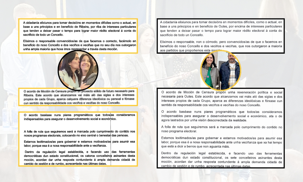 Tras variaren no treito seguinte -en Outes para afirmar que en 2023 o electorado xa desexaba un cambio e en Ribeira, "un proxecto de futuro"-, indican que "a veciñanza non se merece continuar padecendo" ou que "sería inescusable agochar a cabeza e mirar para outra parte". "Parte dos motivos que nos levan a dar este paso, son os seguintes", escribiron nos dous documentos para, a continuación, indicar motivos que en varios treitos son tamén idénticos.