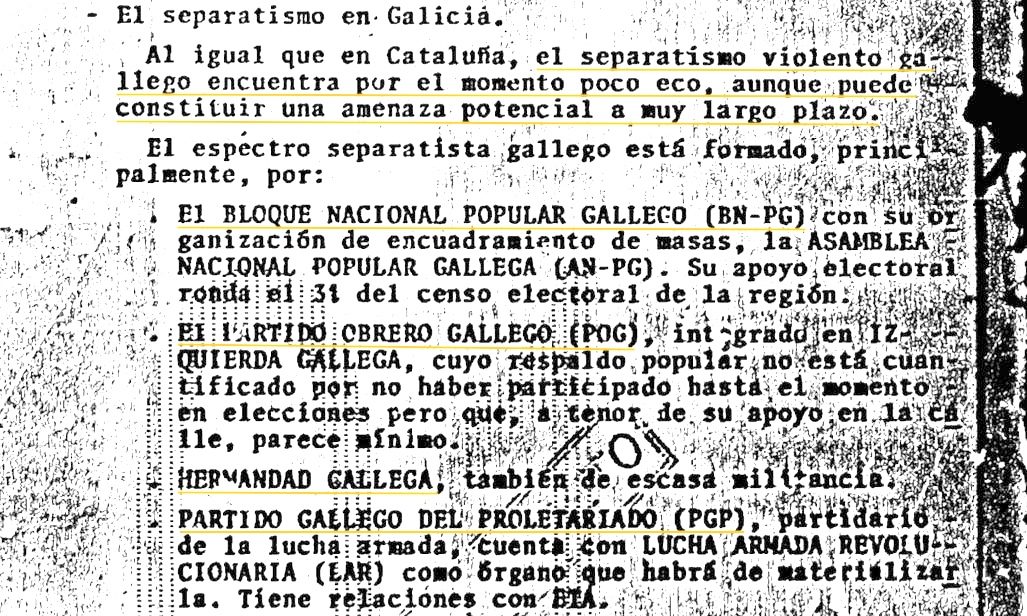 Á marxe desa prognose sobre o separatismo violento, o informe militar de dúas semanas antes do 23F di que "o espectro separatista galego" estaba formado, "principalmente", por catro entidades. A primeira citada é o Bloque Nacional Popular Galego (BN-PG), do que di que "o seu apoio electoral rolda o 3% do censo electoral da rexión". A segunda organización é o Partido Obreiro Galego, "integrado en Esquerda Galega, cuxo respaldo popular non está cuantificado por non participar ata o momento en eleccións pero que, a tenor do seu apoio na rúa, parece mínimo".