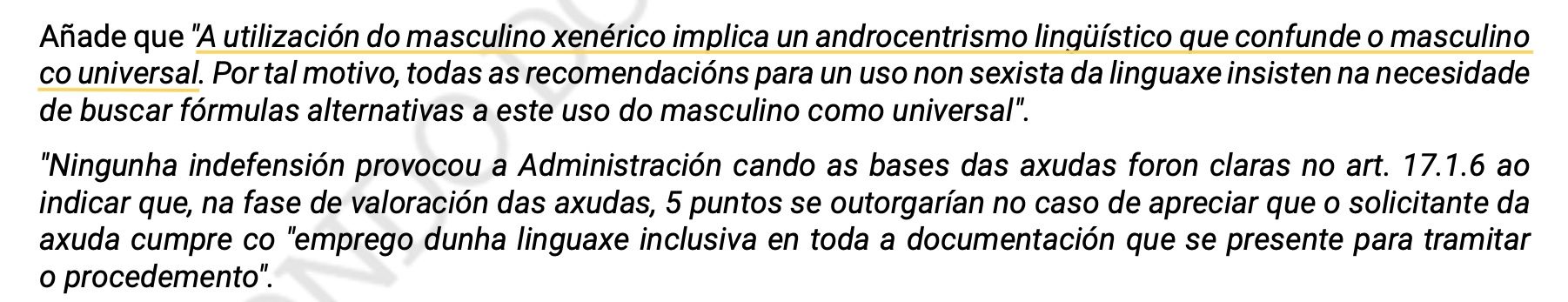 O Tribunal Superior de Xustiza de Galicia (TSXG) vén de facer pública unha sentenza que avala que a Xunta denegase unha axuda de 10.000 euros ao emprendemento feminino a unha empresa que non empregou na súa solicitude unha linguaxe inclusiva. A convocatoria de subvencións contemplaba puntuar máis as solicitudes que empregasen linguaxe inclusiva e o Goberno galego argumentou que "o masculino xenérico implica un androcentrismo lingüístico que confunde o masculino co universal".