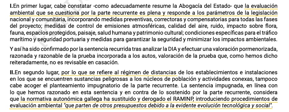 O Supremo considera por unha banda que, logo de anteriores eivas, agora a declaración de impacto ambiental realizada para esta legalización "é plena e responde aos parámetros da lexislación nacional e comunitaria, incorporando medidas preventivas, correctoras e compensatorias para todas as fases do proxecto", incluídas "condicións específicas para o tráfico marítimo", elemento especialmente cuestionado polos recorrentes.
