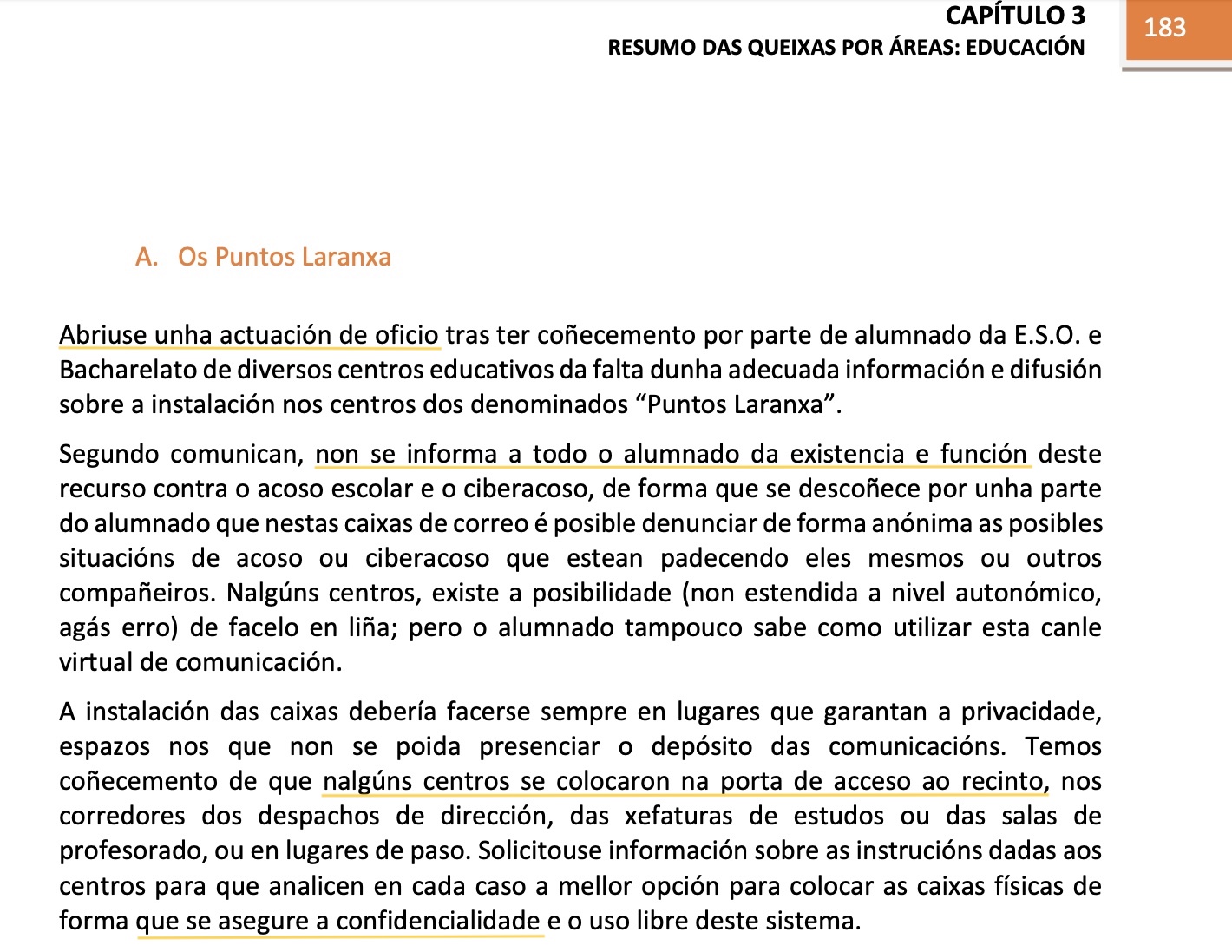 A Valedora abriu unha investigación de oficio tras ter coñecemento por parte de alumnado de ESO e Bacharelato "de diversos centros" da "falta dunha adecuada información e difusión" dos Puntos Laranxa, caixas de correo nas que se poden formular denuncias anónimas sobre acoso escolar. Tamén sinalou a falta de información sobre a posibilidade de formular a través de medios dixitais esas mesmas denuncias anónimas e confidenciais "nalgúns centros".