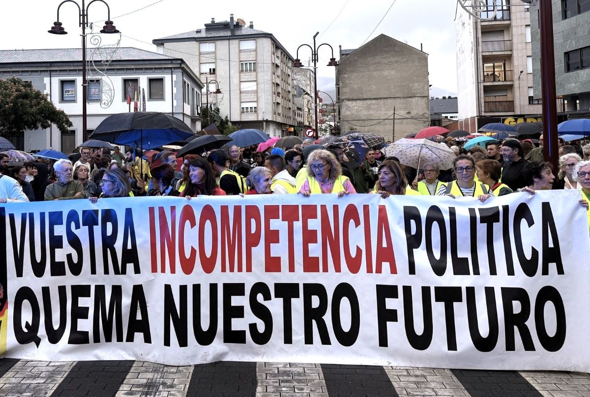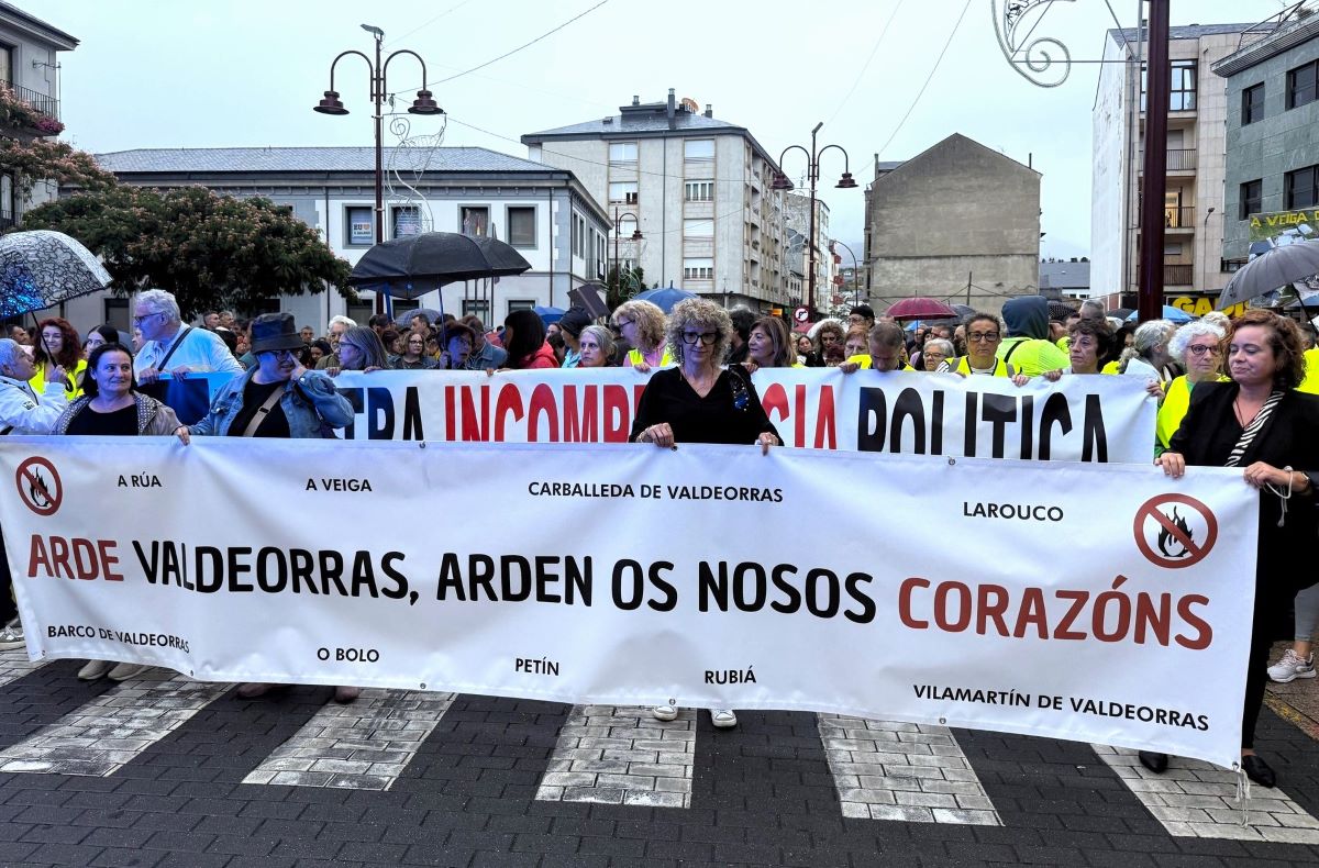 "A vosa incompetencia política queima o noso futuro" ou "Arde Valdeorras, arden os nosos corazóns", podíase ler nunha grande pancarta dunha marcha que contou cunha importante representación institucional e social e na que algúns carteis pedían a dimisión de Alfonso Rueda.