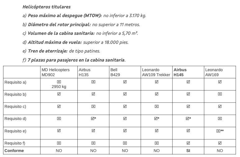 Unha fonte coñecedora do funcionamento interno do servizo admite as vantaxes en Galicia dalgunhas das esixencias do contrato. Que se pida tren de aterraxe de patíns e non de rodas facilita a operación en terras brandas, ou que se pida un rotor de cola protexido tipo Fenestron, patente de Airbus, ofrecerá máis seguridade ante o arborado e a dispersión poboacional galega. Pero admite que a combinación de todos os condicionantes parece encamiñada a que se preste cun modelo concreto de Airbus, que mesmo considera "acertado" pero de dubidoso encaixe canto a defensa da libre competencia nun concurso público.