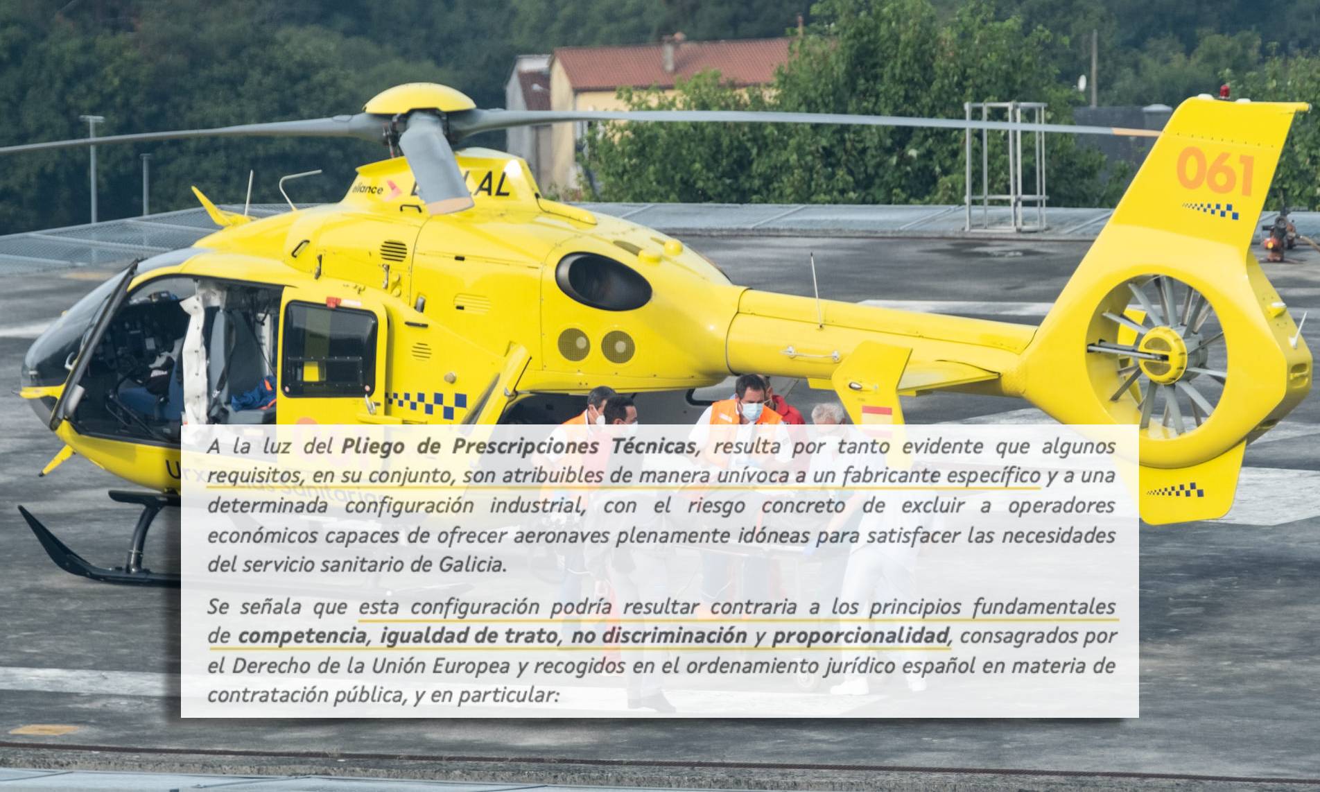 "Resulta evidente que algúns requisitos, no seu conxunto, son atribuíbles de maneira unívoca a un fabricante específico e a unha determinada configuración industrial, co risco concreto de excluír operadores económicos capaces de ofrecer aeronaves plenamente idóneas para satisfacer as necesidades do servizo sanitario de Galicia". Quen así se pronuncia é unha posible candidata ao concurso público convocado polo 061 para renovar o servizo dos seus dous helicópteros de emerxencias sanitarias, con base en Santiago e Ourense. Un servizo que vén rexistrando ducias de eivas nos últimos anos, malia o cal a Xunta vén demorando a renovación do seu contrato, que pode ascender a uns 7 millóns ao ano durante 8 anos.